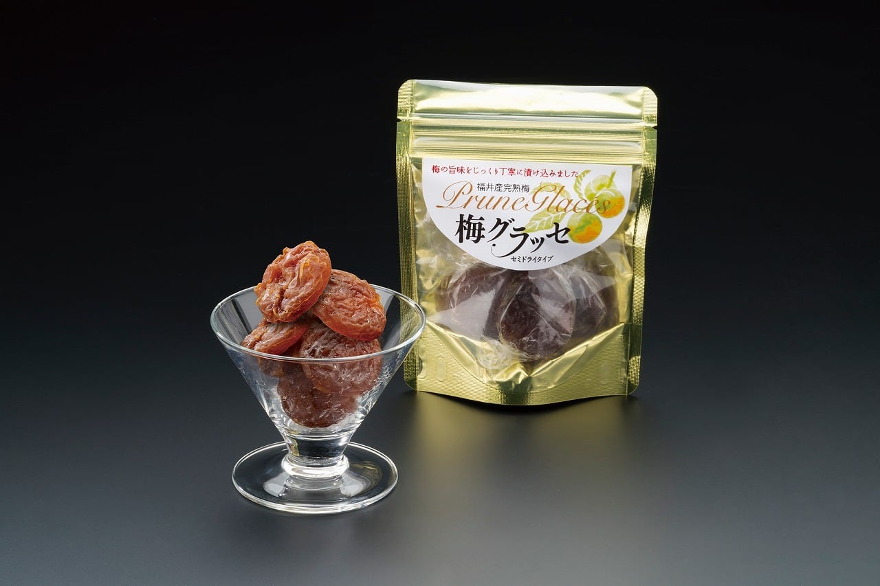 福井県産の完熟梅と砂糖のみで漬け込んだ無添加の菓子です。梅は果肉に弾力があることが特徴の紅映梅(べにさしうめ)を使用しています。漬込みながら、砂糖を適量、適時追加し、半年以上かけ糖度を少しずつ上げています。さらに漬込み時、あえて発酵させながら糖度をあげることで、アルコールの風味をつけています。この梅をセミドライし、果肉の弾力を残しつつ旨味を凝縮しています。。個包装でお召し上がりやすいです。